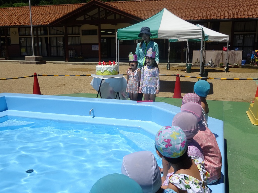 年中、年長さんはプールで誕生会をしました。お日様の光がプールに反射して夏らしくとっても涼しげでした。お楽しみは水中カルタ取りを行いました。顔に水がかかっても平気でプールに浮かぶ絵札を一生懸命探していました。