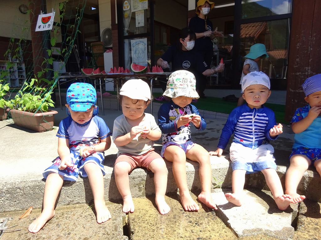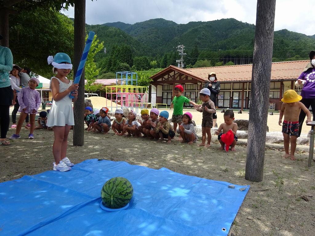 今年は畑にすいかの苗を一株植えたところ、10玉以上も収穫できました。そこで、年長さんがすいか割りを体験。なかなか割れない丈夫なすいかでした。 また暑い日は度々すいか屋さんがオープンし、冷たいすいかをみんなでテラスでおいしくいただきました。種がいっぱい園庭にこぼれたので来年、園庭にすいかが出てくるかな?