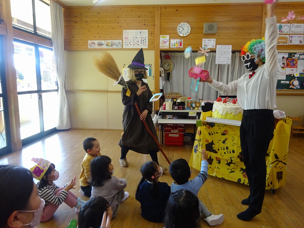 10月はハロウィンがあります。なので今月のお楽しみは・・・魔女のグリーンとその弟子のレインボーが各クラスにプレゼントを届けに来てくれました。しかしプレゼントが消えてしまい空の袋だけになってしまうハプニングが起こってしまいましたが、グリーンとレインボーと一緒に「チチンプイプイのパ!」とおまじないをかけるとプレゼントが現れ一安心。リボンをほどくとかわいいハロウィンのおばけが飛び出し大喜び。ひとつづつプレゼントをもらい、おばけをとばして楽しみました。