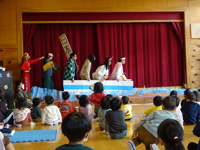益田清風高校3年生総合学科健康福祉系列保育コースの学生さんに「ももたろう」の劇を観せてもらいました。