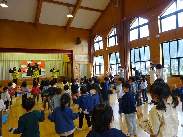 観るだけでなく歌ったり手あそびをしたり一緒に参加して楽しむことができ盛り上がりました。お礼に子ども達から歌のプレゼント。短い時間でしたが楽しく交流することができました。高校生のお兄さん、お姉さんありがとうございました。