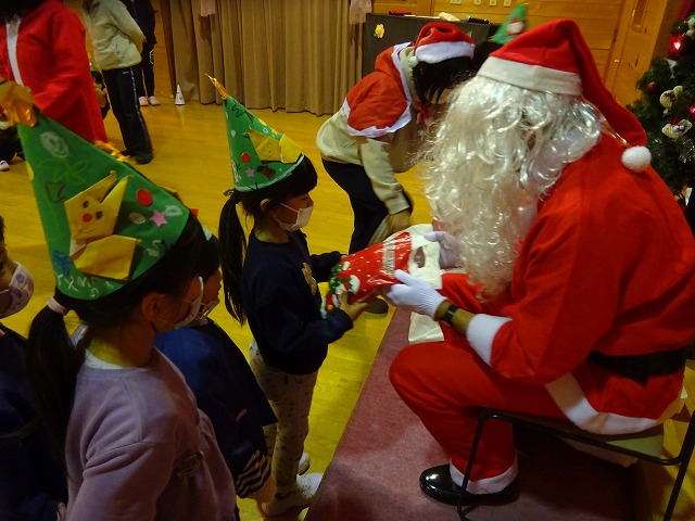 遠くから聞こえる鈴の音。遊戯室に行くとサンタさんが・・・ちょっぴり緊張していた子ども達でしたが、サンタさんに質問したり自分たちの帽子を紹介して過ごすうちにサンタさんを見るまなざしはキラキラに変わっていきました。