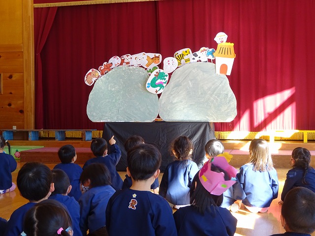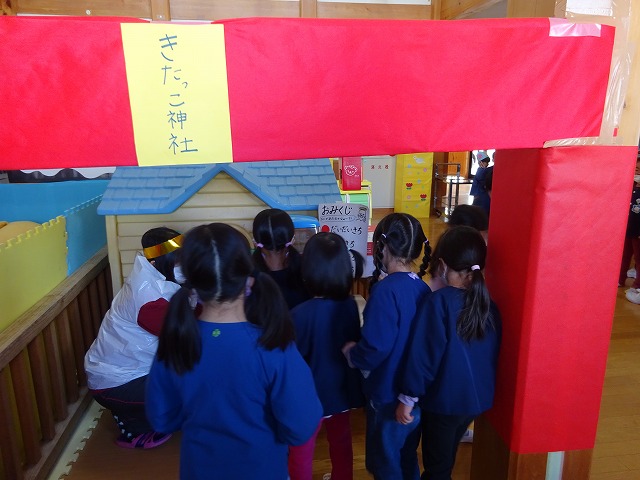 1月のおたのしみは12支のはじまりのお話のペープサート。そこで今年の動物の王様(干支)はうさぎとわかったようです。そして最後は今年の運だめし、「きたっこ神社」でおみくじを引きました。みーんな今年も楽しい一年になりますように❕ お誕生日おめでとう!