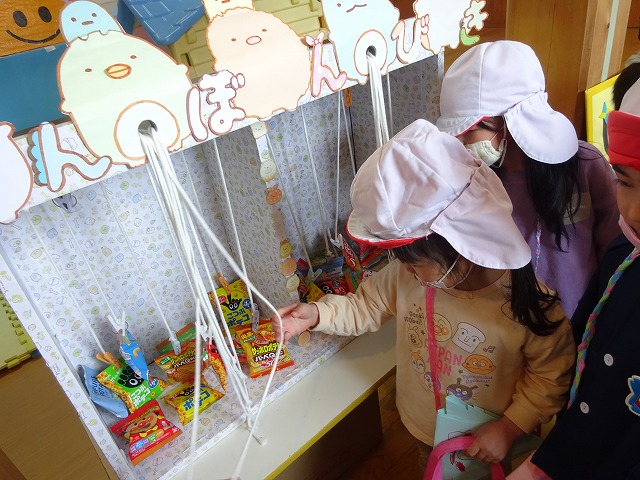 ドン・キホーテ、エディオン、しろくま、フードコート、わたがし&ジュース屋さん、ゲーム屋さんとどのお店も子どもたちがよく知っているのでどのお店で何が売られているのかもわかり品物作りも楽しんできました。「10円です。安いですよ。」「おすしはいかがですか。」など元気な店員さんに圧倒される子もいましたが、お目当ての品物を嬉しそうに買っていました。お家の人へのお土産も忘れずに買い物袋いっぱい買い物を楽しんでいました。