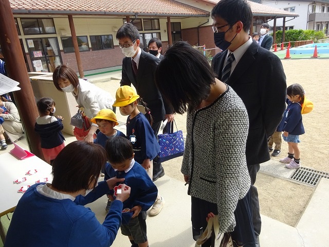 春満開の良い日、おうちの人と一緒に元気に登園してきてくれました。一つ大きくなった喜びにあふれている年中・年長さん、新しい名札をつけてもらい嬉しそうでした。