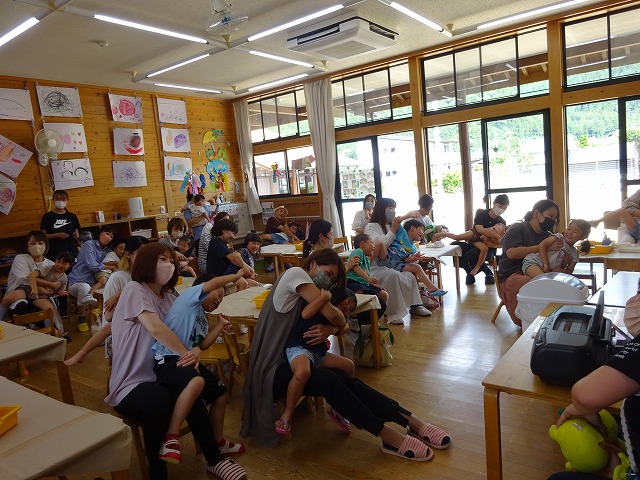 その後、親子で七夕製作をしました。お家の人に温かく見守ってもらい、作り上げた作品。一つ一つ違ってとっても素敵な飾りができました。最後はお家の人のひざに入ってふれあいあそびをしました。バスごっこの曲に合わせてカーブを曲がる時の動きに‘きゃー`’の声やぎゅーっとしてもらった時の嬉しそうな笑顔がとってもかわいく印象的でした。お忙しい中、ご参加下さりありがとうございました。