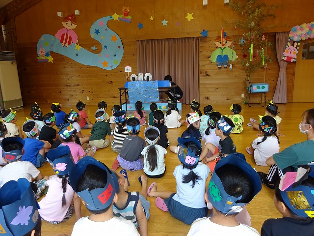 今日は七夕まつり。久しぶりにみんなで遊戯室に集まり、織姫、彦星のおもしろペープサートを見て楽しみました。
