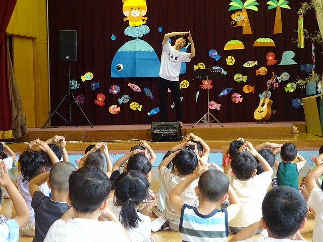 その後各クラスで作った七夕かんむりを子どもたちが紹介してくれました。得意気に発表してくれる姿はとてもステキでした。 今年の七夕のおたのしみは杉山修さん七夕コンサート。歌ったり踊ったりととても楽しいお話で盛り上がり、最後は七夕の歌をギター演奏でみんなで大合唱。とてもステキな会となりました。