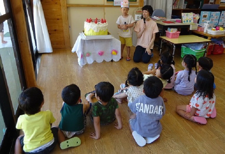 7月は各クラスで誕生日会を行いました。温かい雰囲気の中インタビューにも上手に答え、誕生児の子をみんなでお祝いすることができました。