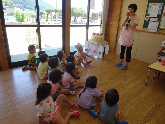 お楽しみでは「おおきなかぶ」のエプロンシアターを見ました。「うんとこしょ、どっこいしょ」と子ども達も参加して大きなかぶを抜くことに成功!みんな喜び合う姿はとてもかわいかったです。 7月生まれのお友達 お誕生日おめでとう!