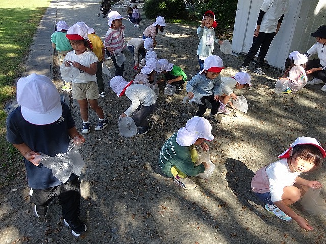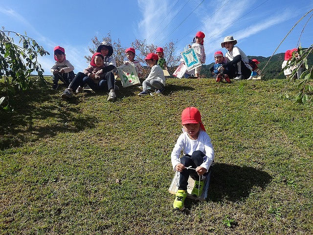 天気に恵まれ、秋晴れの下、飛騨川公園へ。年少・年中さんはバスで、そして年長さんは歩いて遠足に行きました。広い公園内を散策しドングリを拾ったり、土手で芝滑りを楽しんだりと体をたくさん動かし思いっきり遊びました。