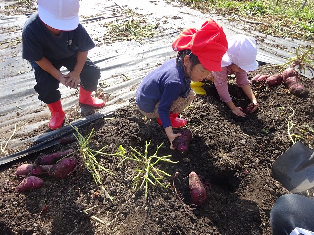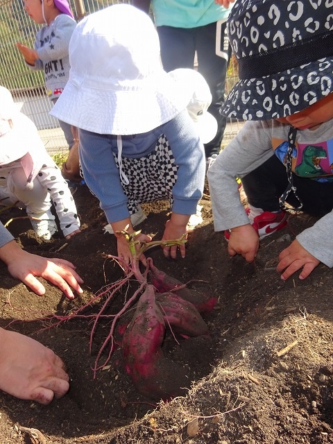 また、年長・未満児さんは園の畑のさつまいもを掘りました。苗を植えてから約5か月、土の中でどのように生長しているのか楽しみに水やりなどをしてきたので、大きなさつまいもが収穫出来て大喜び。手や顔を真っ黒にして芋ほりを楽しみました。