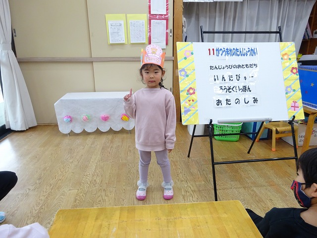 誕生児の友だちもクラスの友だちに見守られ、ちょっぴり照れながらも安心してインタビューに答える姿が印象的でした。アットホームな中で行われた誕生会でした。 ☆11月生まれのお友だち お誕生日おめでとう☆