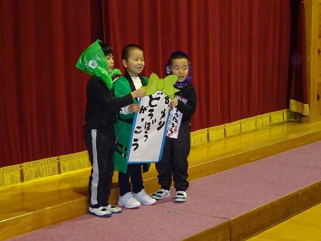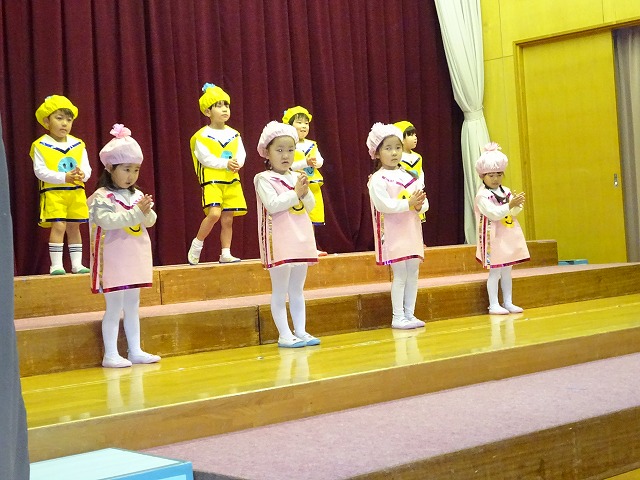 年少さんは初めての発表会。元気一杯ステージに上がったのですが幕が開くと大勢のお客さんにびっくりした様子でした。でも次第に本領を発揮し、歌や遊戯を見てもらうことができました。年中さんは楽器とオペレッタに挑戦しました。リズムを合わせて音を鳴らしたり、役ごとに踊ったり台詞を言ったりと友だちと一緒にできる楽しさを感じニコニコでステージに立っていました。年長さんは最後の発表会。今までの経験を活かし自分たちで意見を出し合い、作り上げていく楽しさを感じながら取り組んできました。遊戯、劇、司会進行と自分の役割を果たそう、頑張ろうという気持ちが強く感じられるステキな姿がたくさん見られました。