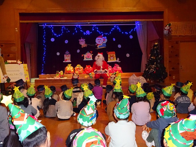 サンタさんに質問したり、一緒に写真撮影をしてもらい、そして待ちに待ったプレゼントに子どもたちも大喜び。歌のプレゼントもでき、サンタさんとのステキな時間を過ごすことができました。そして給食は、縦割りで3クラスに分かれクリスマス会食。特別な雰囲気の中で盛り盛りと食べ、楽しい一日となりました。