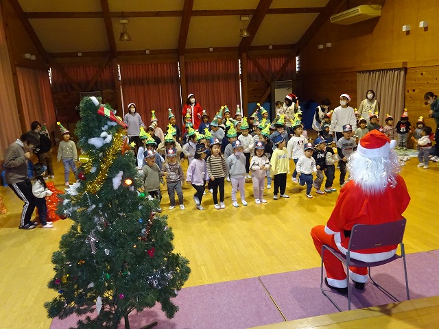 久しぶりに全園児でのクリスマス会。朝から流れるクリスマスソングに子どもたちもワクワク。会が始まってしばらくするとどこからか鈴の音が・・・そしてサンタさん登場!子どもたちのキラキラした表情がかわいかったです。