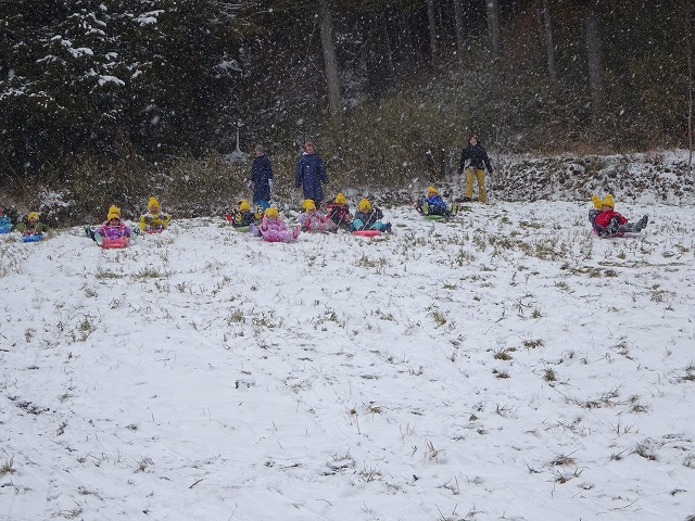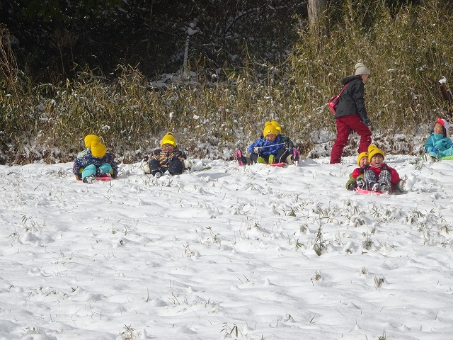 2回共、森のようちえんの上にある広い場所でソリすべりをさせていただき、穏やかな斜面をソリに乗り滑り降りることを全身を使って楽しみました。滑り降りてくる子どもたちの顔は笑顔いっぱいでとても楽しそうでした。「また行きたいなー」と友だち同士話しながら帰ってきた子どもたち。次回に期待している様子です。また雪が降るといいね。