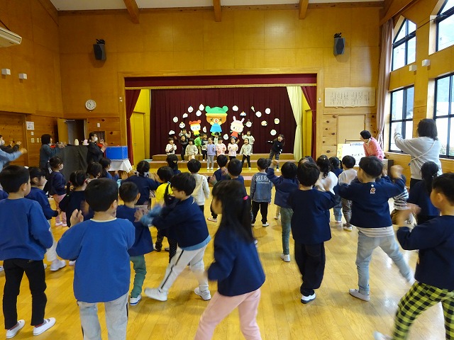 1月生まれのお友だちと、前回お休みで参加できなかった子を含め9名のお誕生日の子のお祝いをしました。嬉しそうにステージに上がり緊張しながらもインタビューに元気よく答えてくれました。