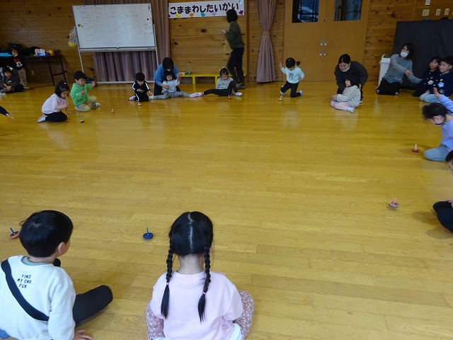 今月のお楽しみはお正月遊びで楽しんできたコマ回しをコマ回し大会としてみんなで行いました。一回勝負なのでコマを持つ手にも力が入る子どもたち。たくさんの声援の中、コマ回し大会を楽しみました。 ☆一月生まれのおともだち、お誕生日おめでとう☆