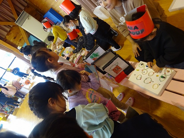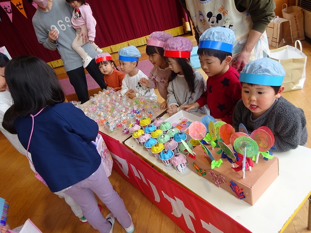 「いらっしゃいませー」「100円です」などのやりとりや大きい子が小さい子に「お金をもらってね」「どれが欲しいの?」と優しく声をかけてくれる姿も見られました。品物はすべて完売。お家の方にもおみやげと大事にバックに入れていた子どもたちです。
