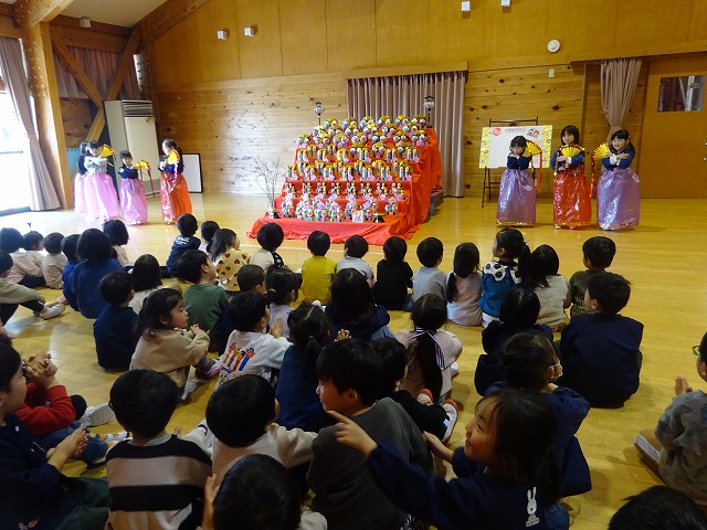 4年ぶりにすずらんの木の利用者の方がひなまつりの会に参加してくださいました。子どもたちが製作したおひな様の紹介をしたり、一緒に歌をうたったり、パネルシアターで雛様の由来を知ることができました。また男の子たちが代表で肩たたきをしておばあちゃんたちと触れ合い、女の子がひな様になって踊りを踊るなど地域の方々と一緒に楽しむことができました。