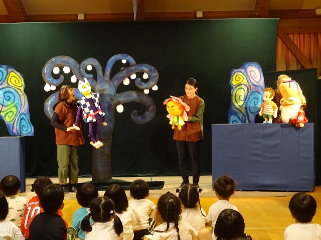 劇団むすび座さんによる劇を楽しませてもらいました。二つのお話をみせてもらいました。、子ども達は劇の世界に引き込まれ、みんな真剣に見入っていました。