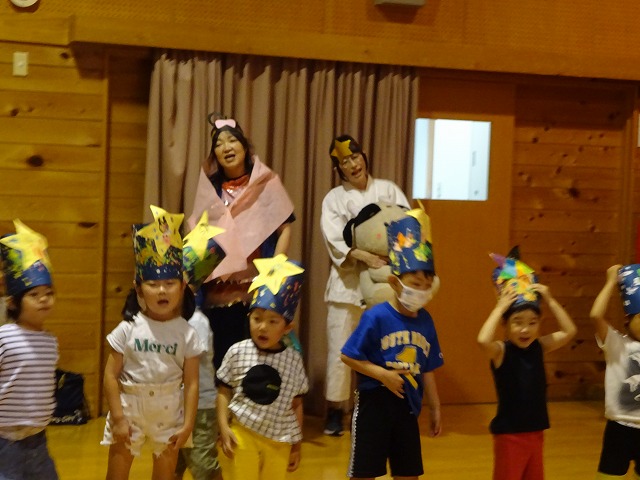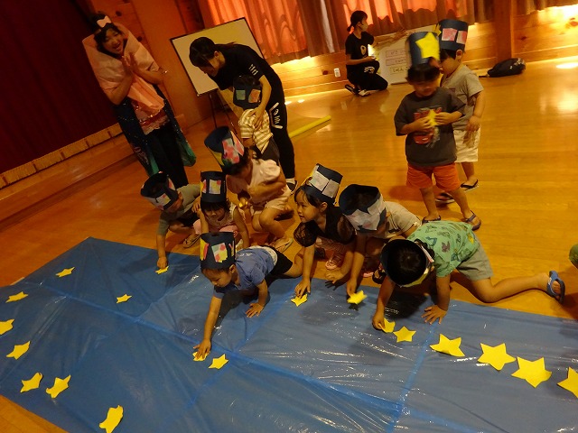 職員による七夕の劇を観劇し、織姫と彦星が無事に会えるように、天の川にお星さまを貼るお手伝いを子ども達にもしてもらいました。最後は七夕の歌を歌って楽しい会は終わりとなりました。