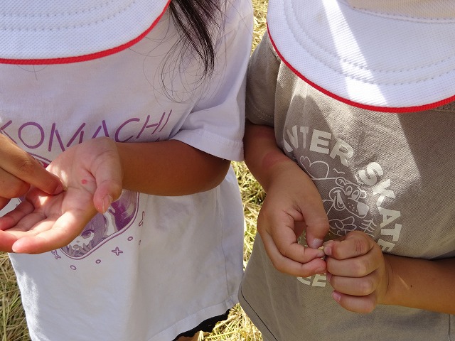 年長児が春に田植えを体験させていただいた小さな苗が、立派な稲穂へと生長し収穫の時を迎え、今回は稲刈り体験をさせてもらいました。お米がどこにあるのか、実際に触ってお米の固さやもみを剥いて色を確かめたりと普段食べているごはんになる前のお米との違いを知ることができました。 また、一人ひとりコンバインに乗せてもらい、収穫体験。あっという間に刈りとらえる稲に驚く子ども達でした。