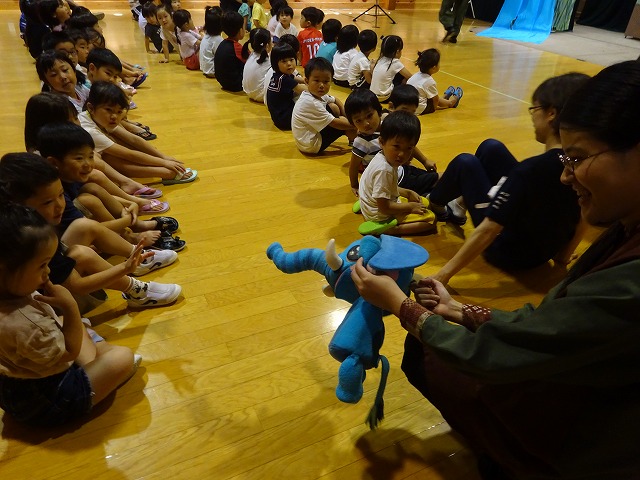 劇団むすび座さんによる劇を楽しませてもらいました。二つのお話をみせてもらいました。、子ども達は劇の世界に引き込まれ、みんな真剣に見入っていました。 |