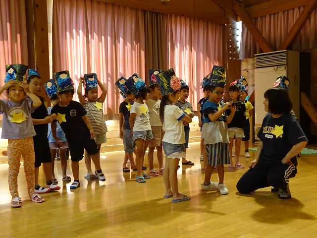 会の初めに、作った冠の紹介をしました。どの学年も天の川をイメージして、絵の具やキラキラのシールを使ってステキな冠ばかりでした。 |