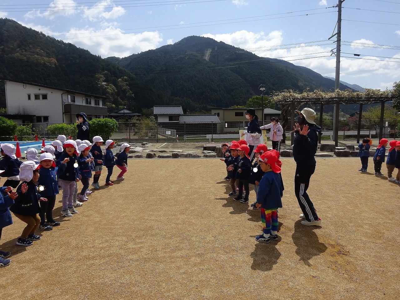 全園児で園庭に集まり、新入園児歓迎会を行いました。最初は、年中・年長さんがお手本となり『おはようのうた』と『きたこどもえんのうた』を歌いました。 |