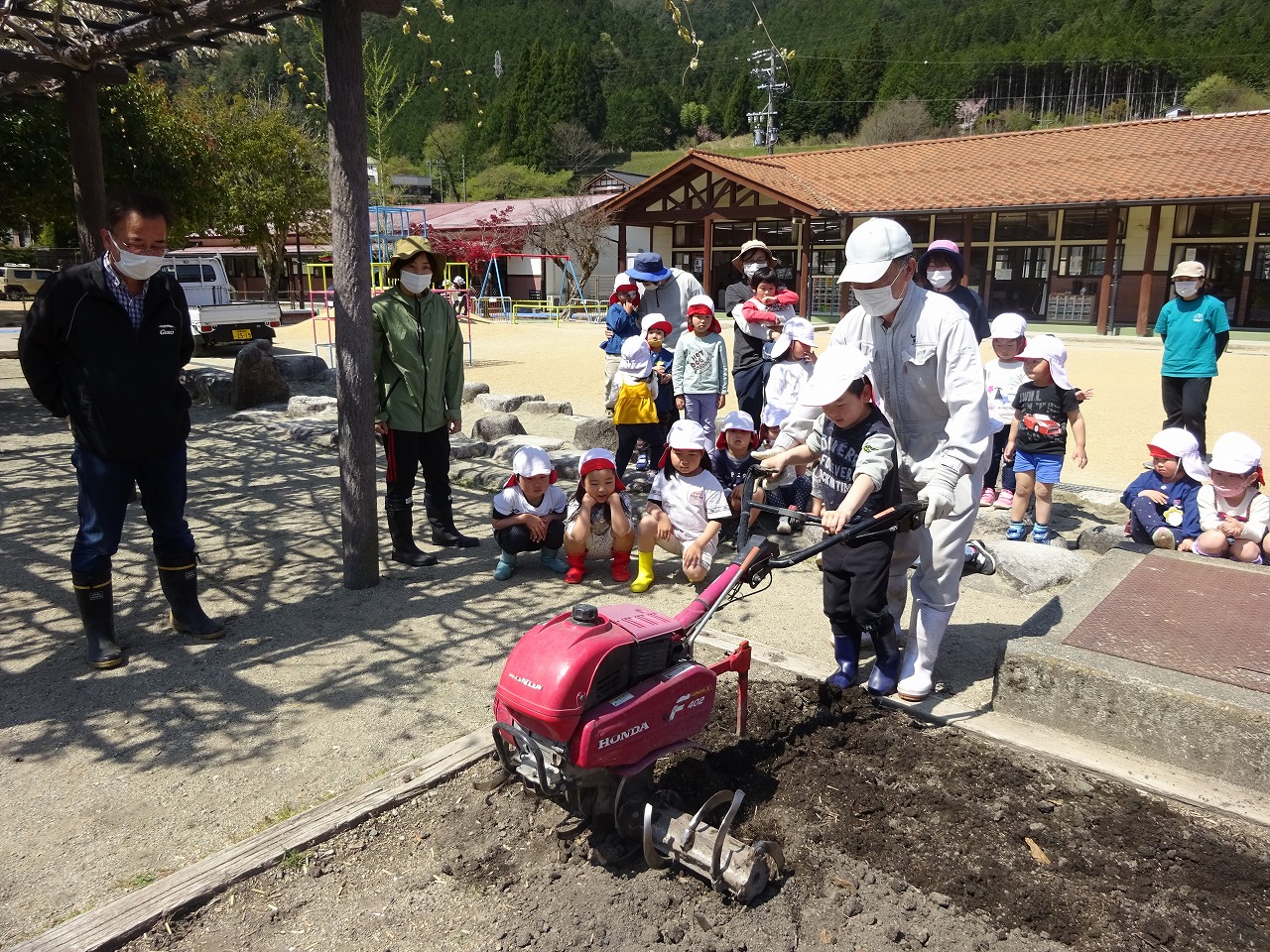 年長さんが農園開きをしました。耕運機は初体験の子が多く「初めて運転する〜」とワクワクする様子も見られました。 |