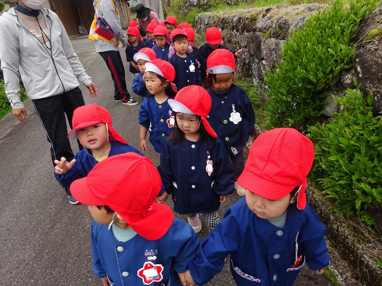 天気の良い日が続き、散歩に出かけています。このような時期ですので他の学年との交流はなるべく避け、散歩も学年ごとに行くようにしています。 |