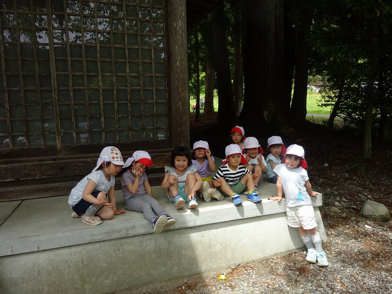 今回の遠足は学年ごとに違う場所に行くことにしました。年長さんは「森のようちえん」に行きました。 |