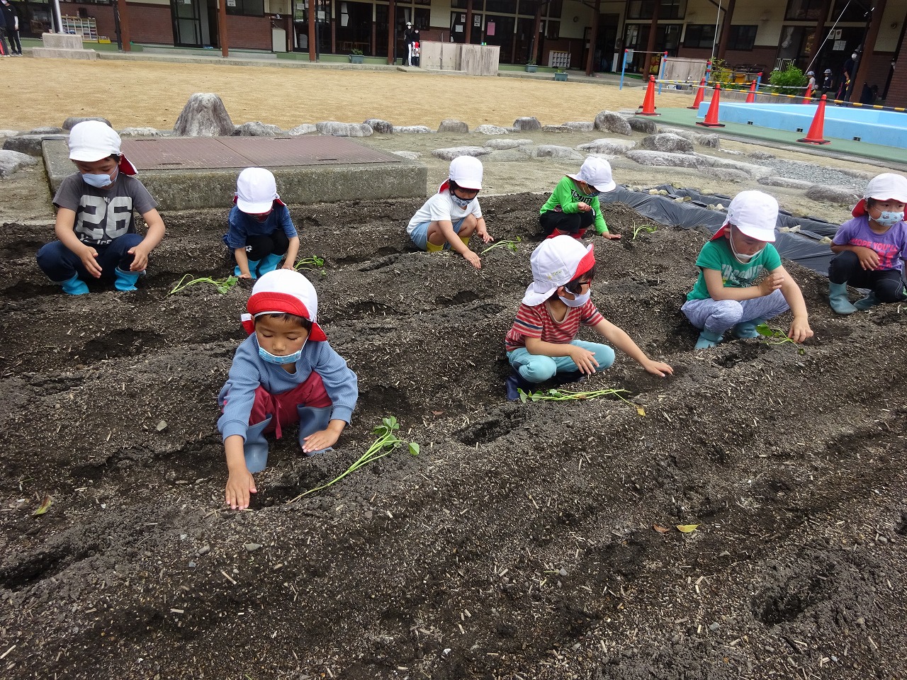プランターにトマトの苗を植えました。明日からは当番さんが順番に水をあげてくれます。 |