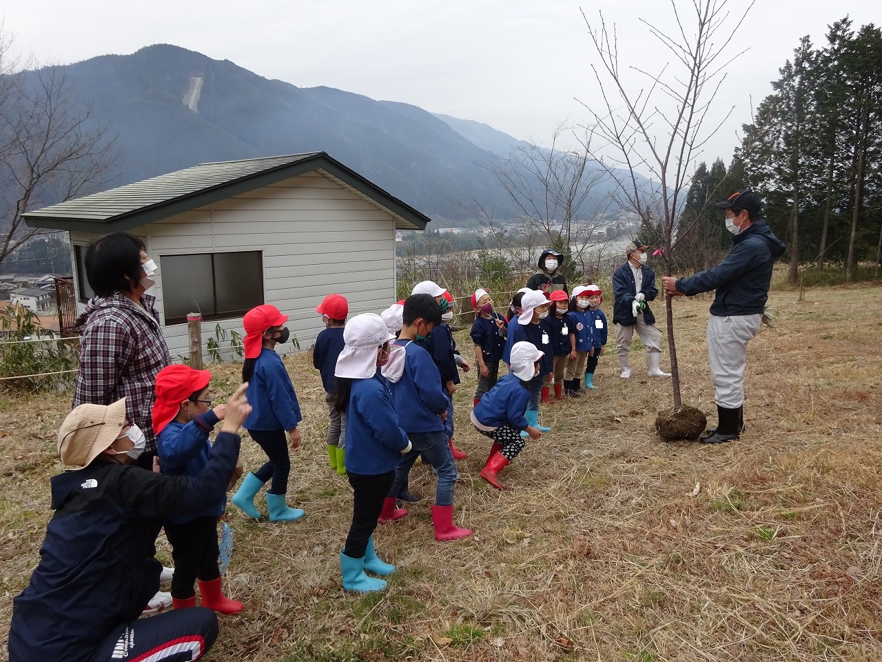 年長さんが『もりのようちえん』へ行き、毎年恒例の卒園記念植樹をしました。 |