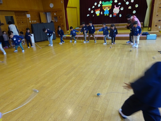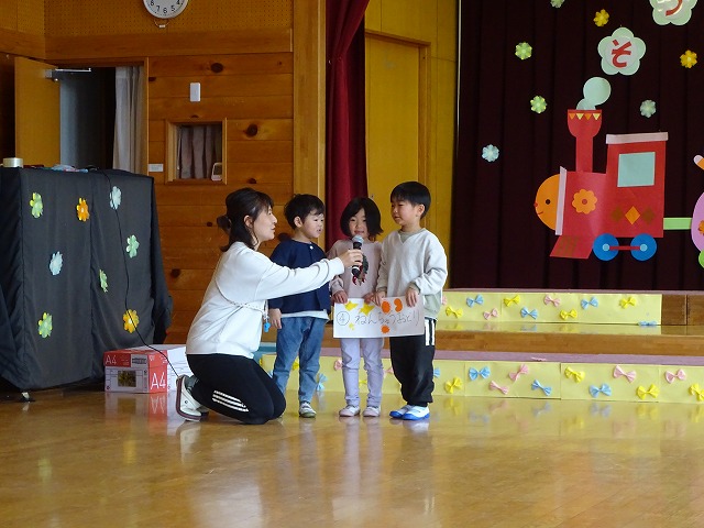 年中さんが司会を行い、もうすぐ卒園を迎える年長さんのお別れ会を開きました。各学年毎に出し物を考え、歌や踊りを披露し、それを見てキャッキャッと笑う年長さんの姿が微笑ましかったです。 |