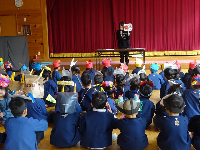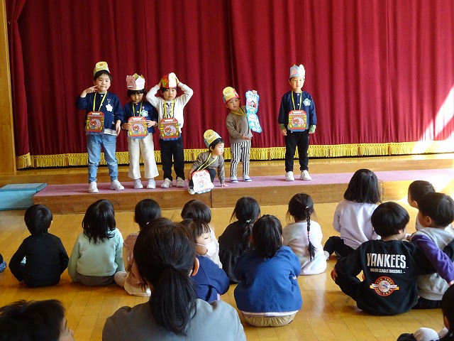 遊戯室で全園児が集まり節分の会を行いました。手作りの鬼のお面やマスを誇らしげに紹介してくれ、かっこいい鬼のお面をつけて豆まきするぞ!と意気込みも十分でした。 |