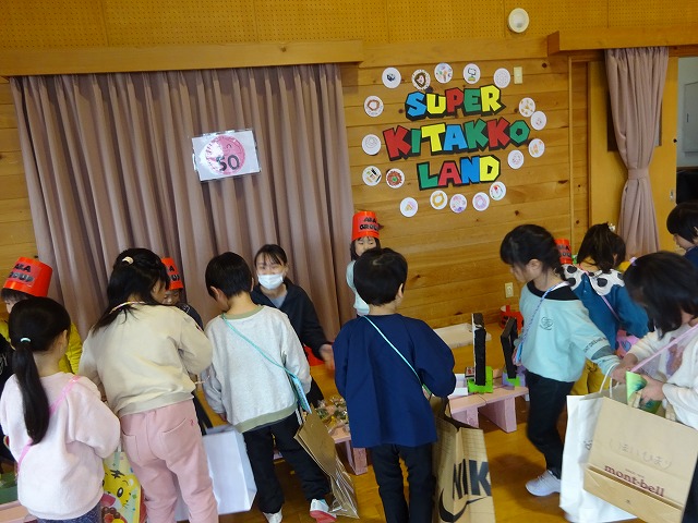 自分たちで作った品物がたくさんお店に並べられました。スーパーきたっこランドが遊戯室にオープン。アイスクリームやドーナツ。本物みたいにおいしそうなお寿司や焼きそば。思わず遊びたくなるゲームやパソコンにきれいなお花やマフラーなどどれも魅力的で全部欲しくなり吟味して買うのは大変そうでした。 |