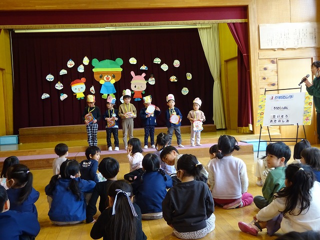 2月生まれの6人のお友だちの誕生会をしました。大きくなったら…のインタビューでは「お医者さん」「スポーツ選手」「ウルトラマン」…などどの子も目を輝かせてて堂々と答えてくれました。 |