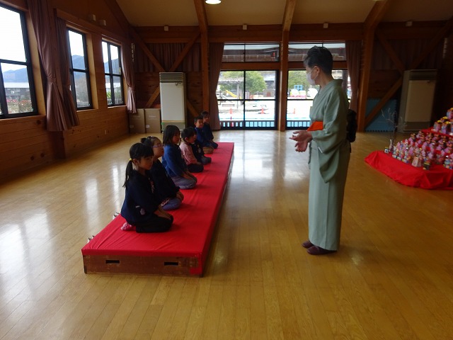 おひな様の前で1年生になるお祝いもかねて年長さんが初めてのお茶会に参加しました。お茶の先生に礼儀作法を教えていただき、正座して座り運ばれてくるお菓子とお抹茶を堪能しました。 |