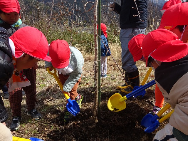 3月13日に年長さんが卒園記念植樹を森のようちえんにて行いました。しだれ桜の若木を2本、2つのグループに分かれスコップを上手に使い丁寧に植えることができました。何年後かに子どもたちの植えた桜の木が花を咲かせ森のようちえんに彩を加えてくれる日を楽しみにしています。 |