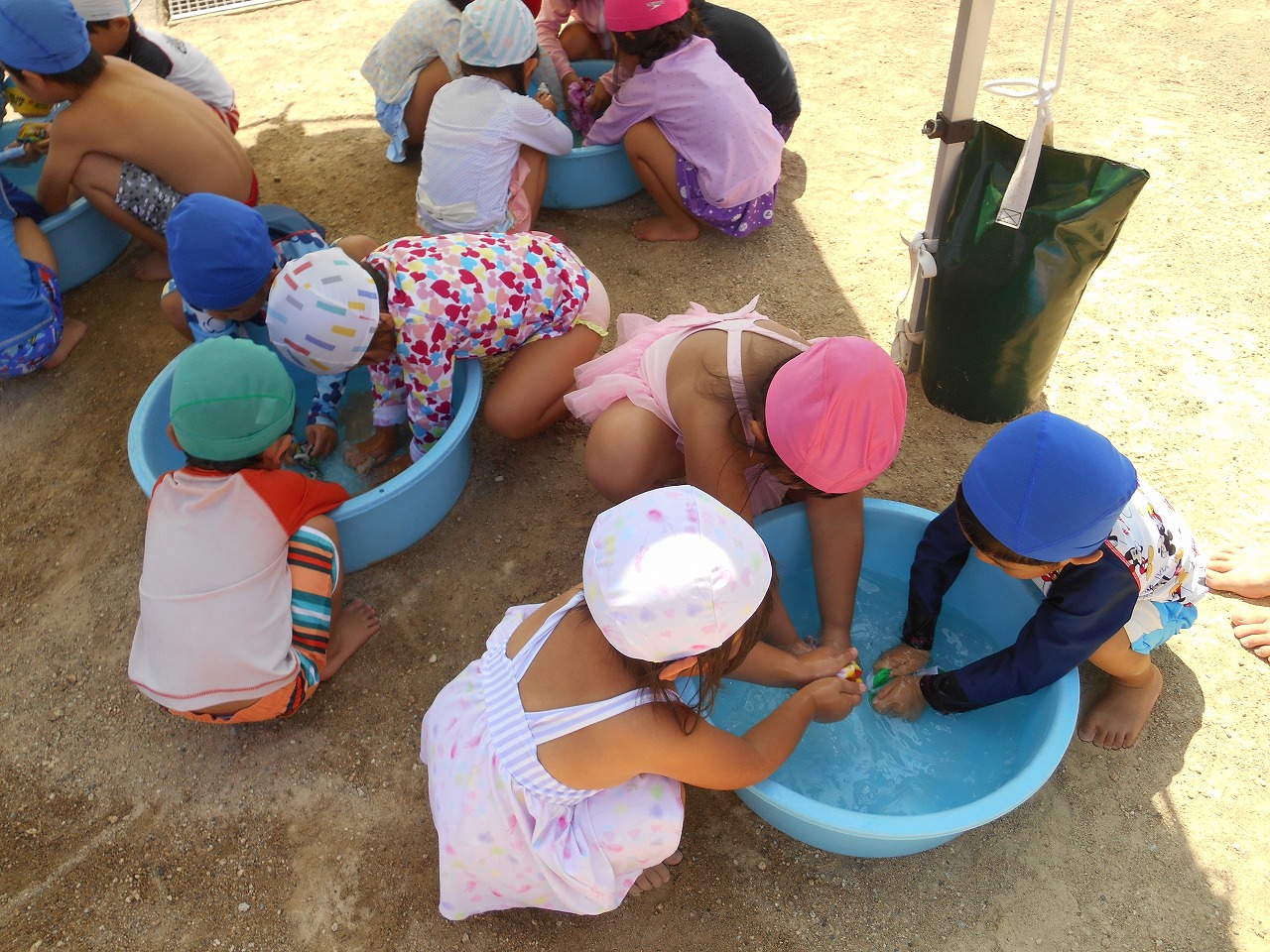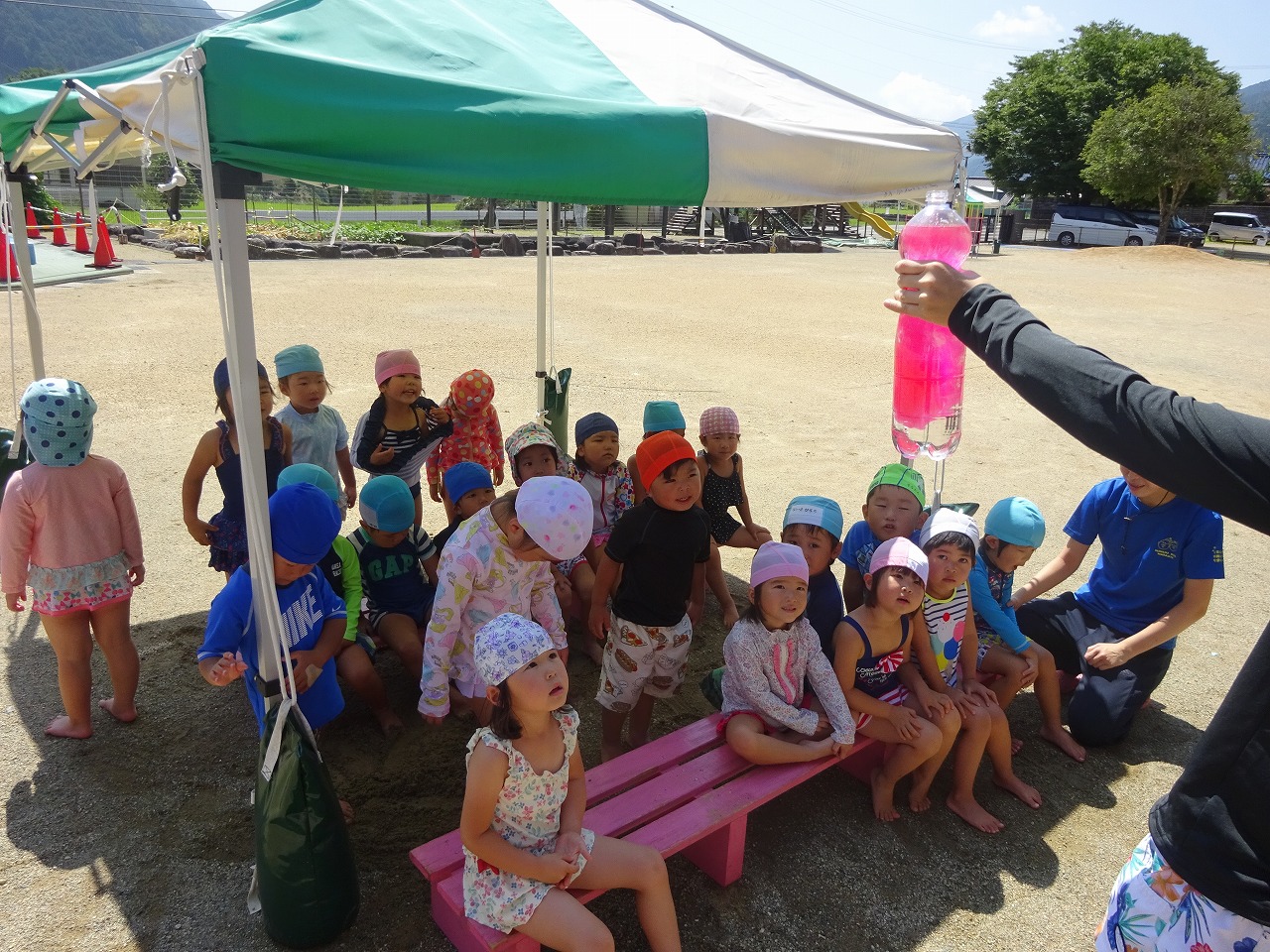 年少さんが色水あそびを楽しみました。まずはじめに保育士がペットボトルの水に絵の具を入れるところを見ると、だんだん混ざっていく様子に「わぁ、変わった」「ピンク色のになった〜」と大興奮でした。 |