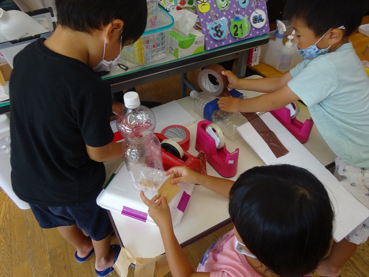 年長さんが、家から持ってきた材料や園にある材料を使って船を作りました。早速、作った船をプールで浮かべてみると・・・バランスが悪く転倒したり、くっつけたテープがはがれてしまったりとなかなかうまく浮かびませんでした。でも、そこであきらめない年長さん。次の日は反省点を生かしてもう一度作り直しました。 |