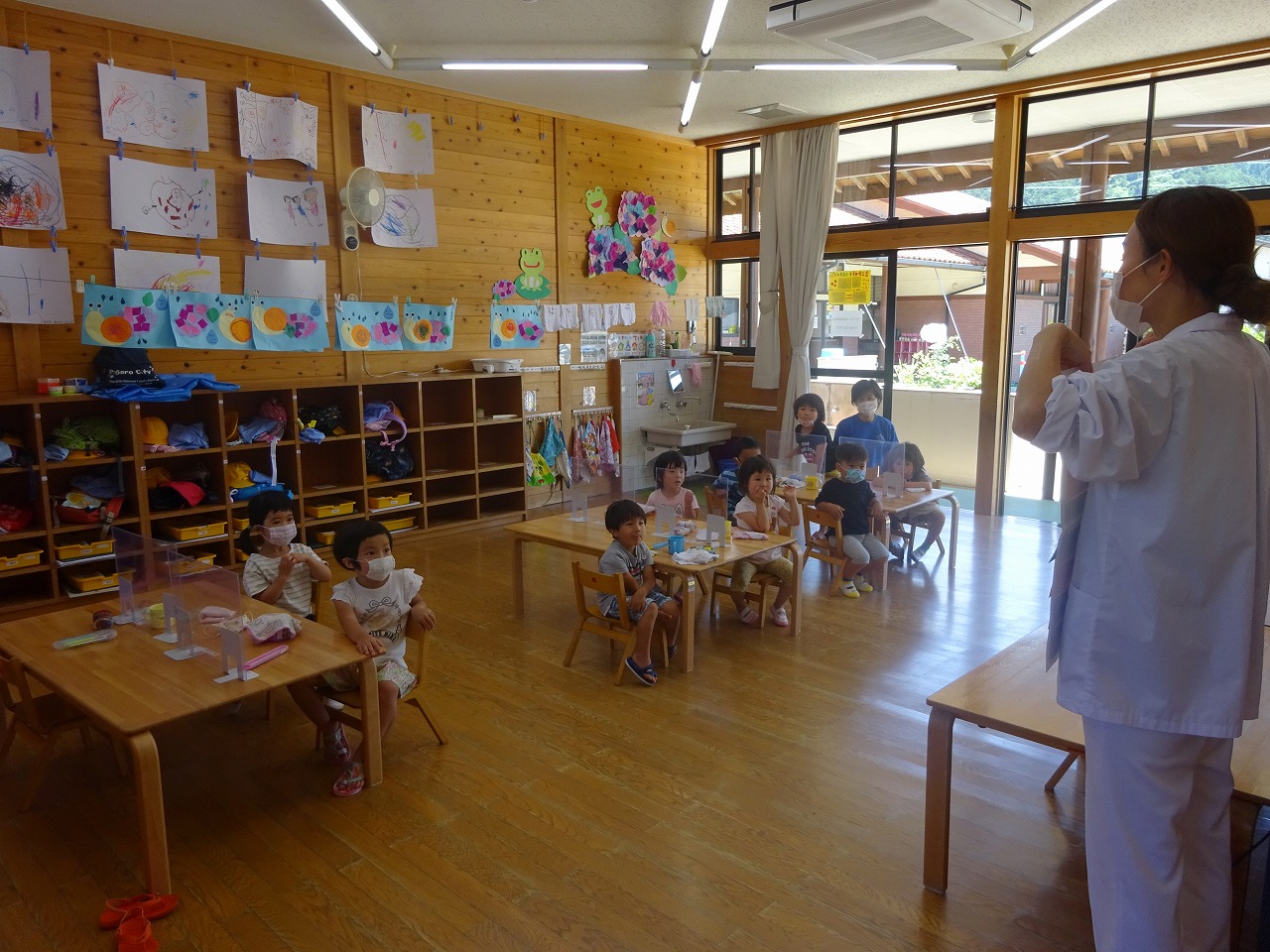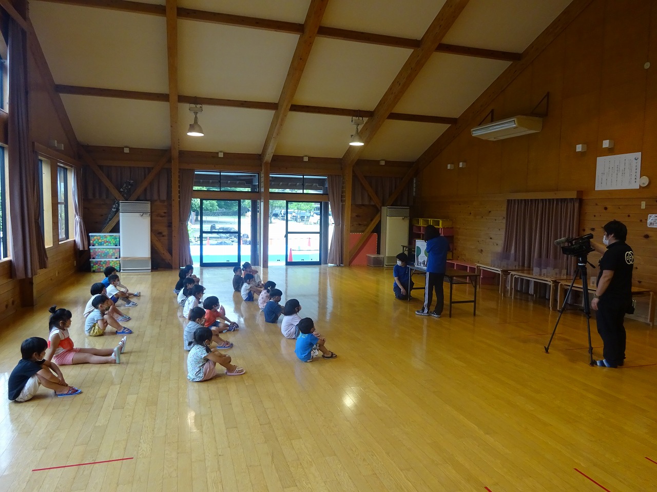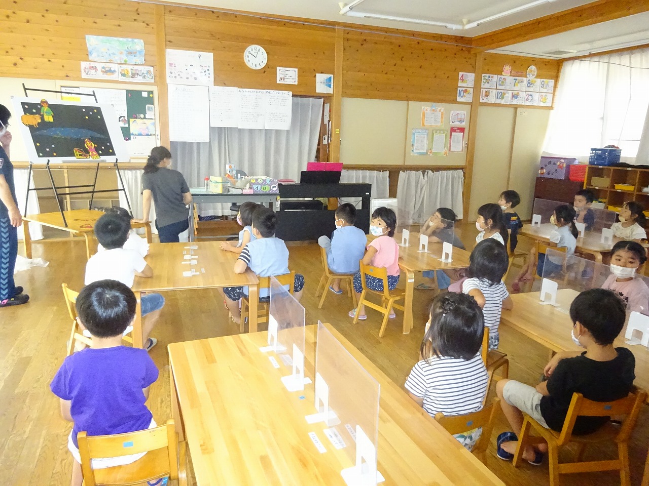年中さんは、遊戯室で大型絵本を見る様子と、給食の様子を撮ってもらいました。 |