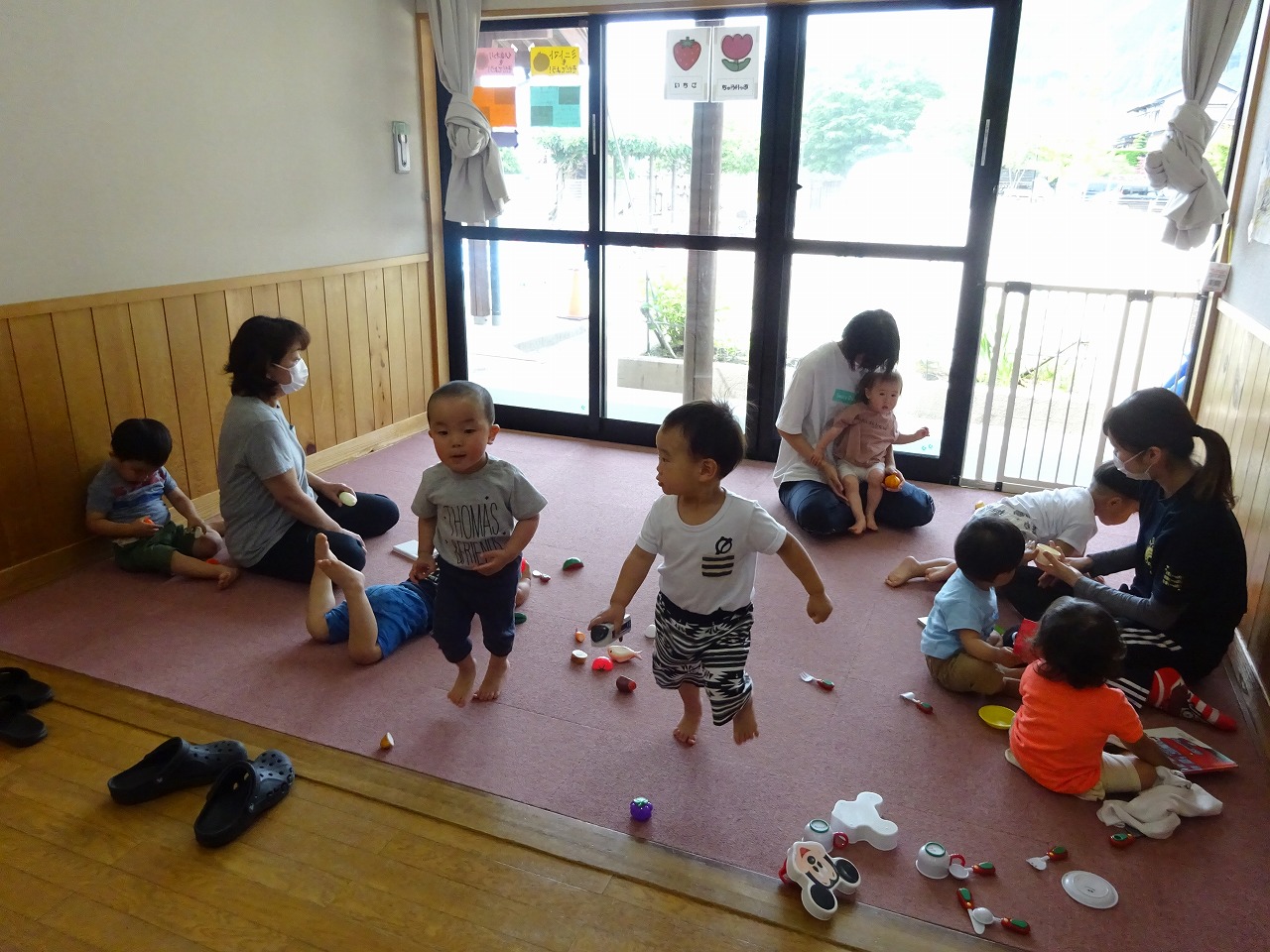 分散登園では泣いていた子も今日は泣くことなく、保育士の膝に中に入って可愛い笑顔をいっぱい見せてくれました。 |