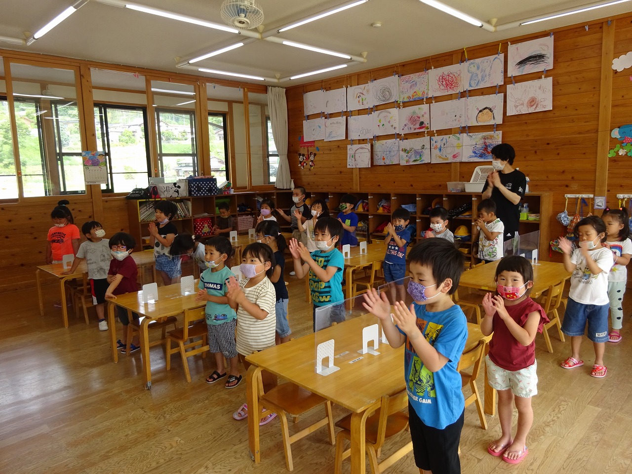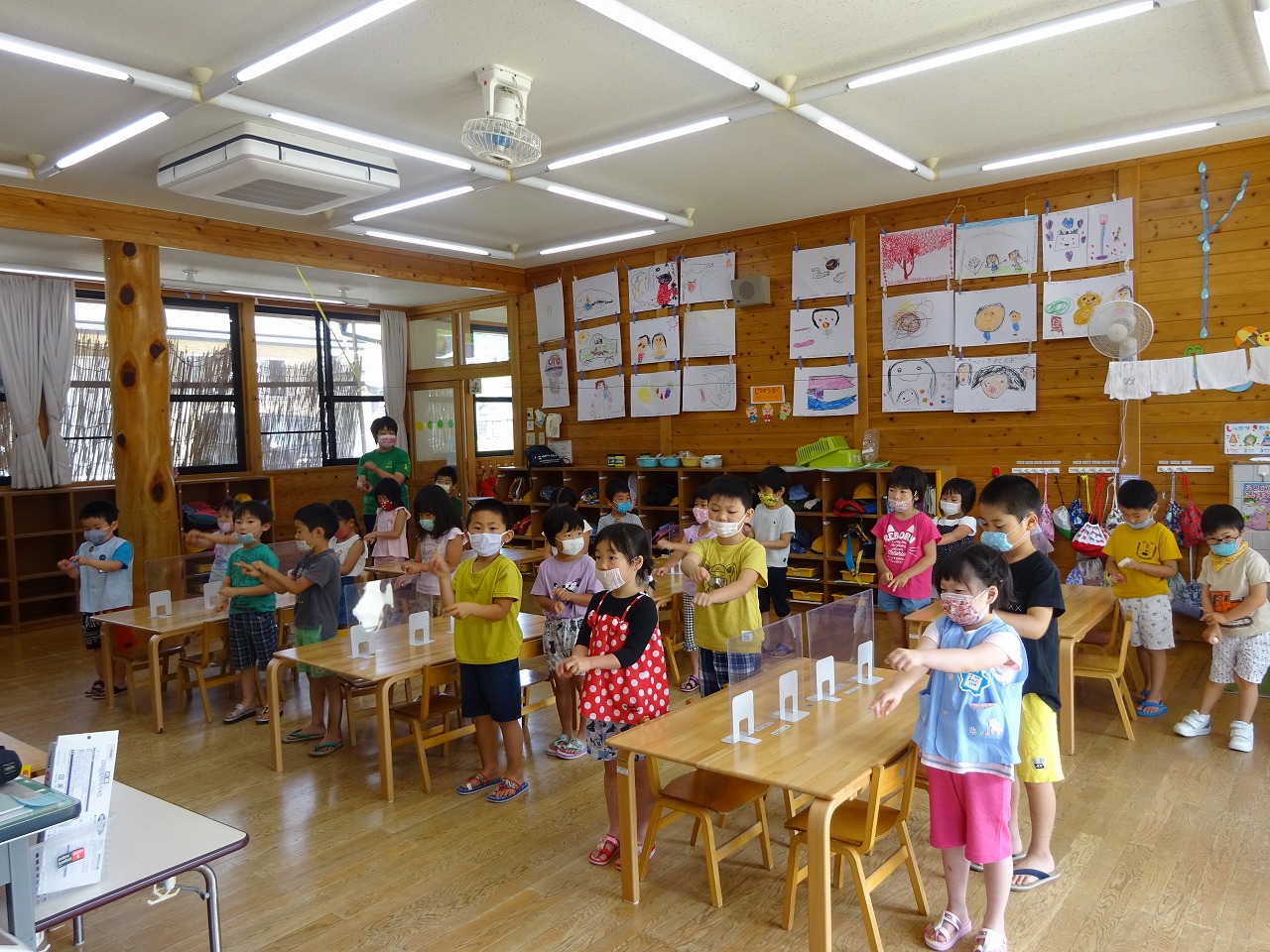 今日から22人全員揃うということで、嬉しそうに登園してくる子どもたち。感染予防をしながらの新しい生活スタイルも分散登園中に身につけ、自分たちで気づいて声をかけ合う姿も見られます。 |