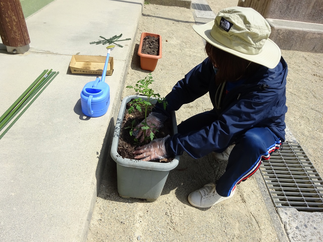 年中さんも、先生がミニトマトの苗植えをしました。 |