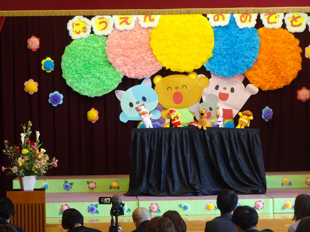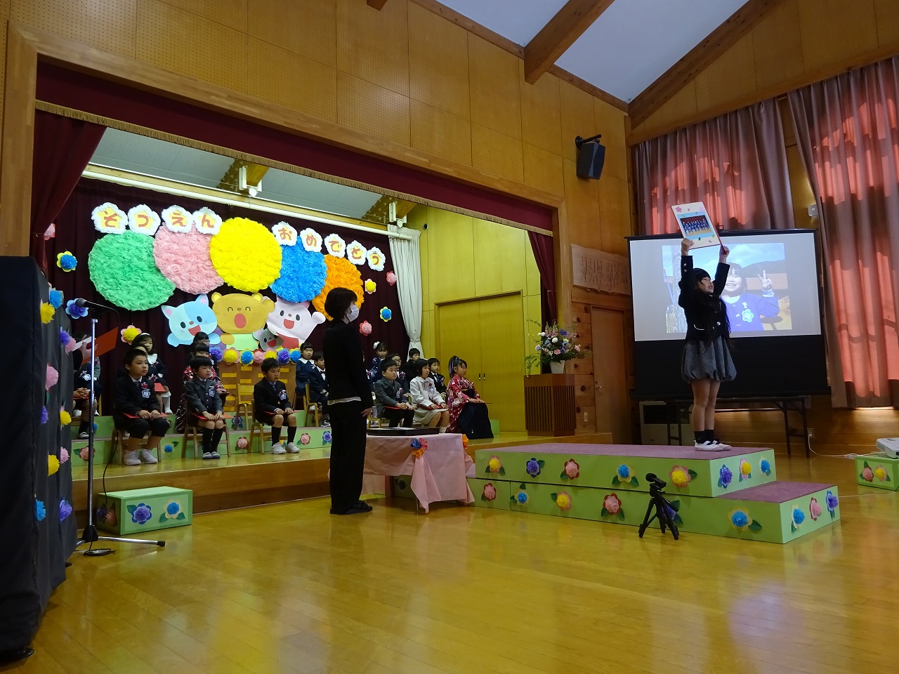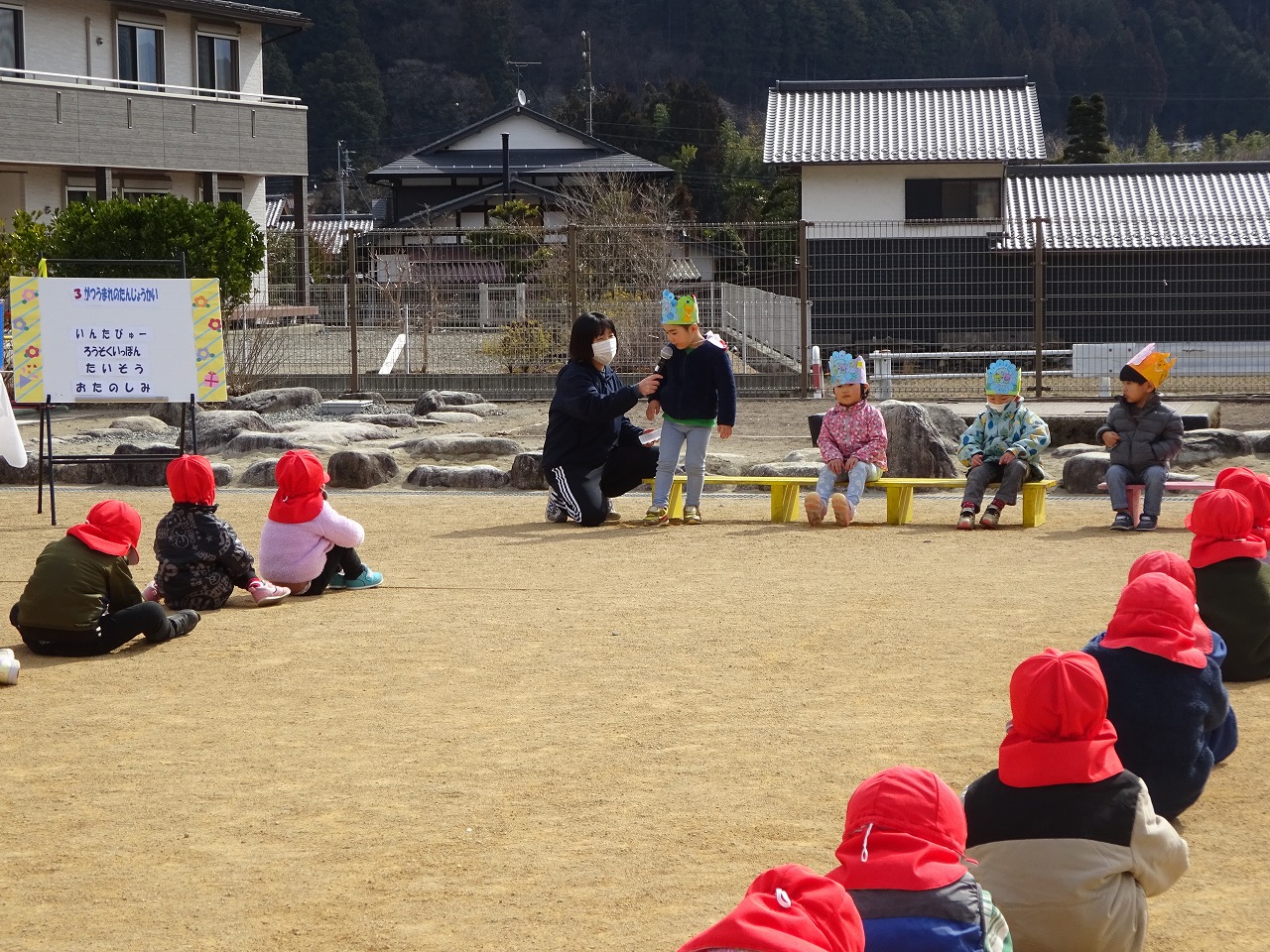 年少さん4名、年中さん1名のお祝いをしました。良い天気に恵まれたので、園庭に全園児が集まって行うことができました。 |
