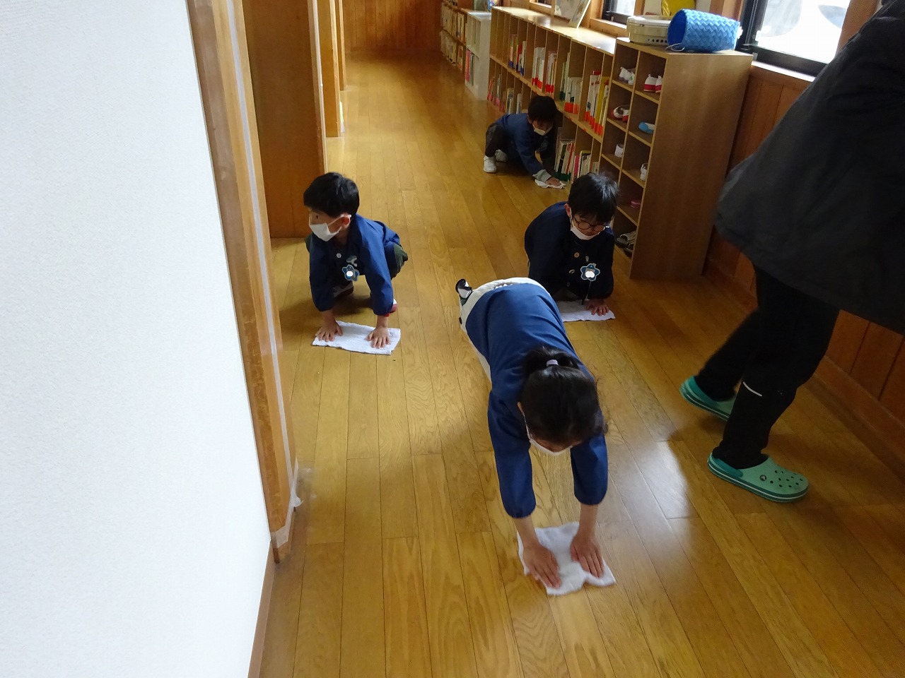 年度末のワックスがけを行う前に年長さんが雑巾がけをしてくれました。 |